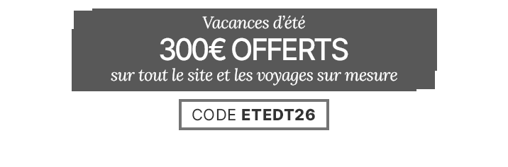 Pour toute réservation effectuée jusqu’au 05 février 2026, bénéficiez de 300 € de réduction* avec le code ETEDT26, dès 3 000 € d’achat, valable sur l’ensemble du site Directours, y compris sur les voyages sur mesure imaginés spécialement pour vous, pour des départs compris entre le 01 avril 2026 et le 31 octobre 2026.